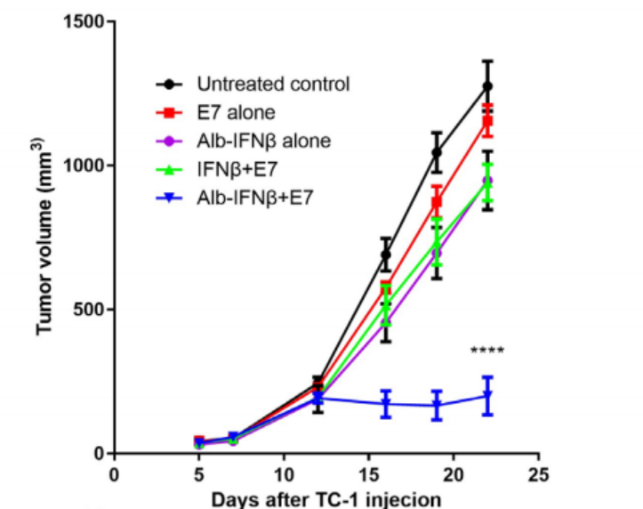 在肿瘤的治疗中,利用HSA载药可以显著提高肿瘤细胞中药物的分布,提高药物靶向性。此外,HSA还具有其他优势:1)与药物融合可延长肽类药物的半衰期,减少用药剂量和药物副作用,减少患者用药次数;2)提高黏蛋白的分泌量,用于滴眼液治疗干眼症;3)与胶原蛋白结合制成止血材料,不仅能结合、运输药物,还使止血材料增加了修复组织功能的作用;4)与聚乙二醇制成水凝胶,可用于外科手术中;5)与粒细胞集落刺激因子形成融合蛋白,可大大延长其半衰期[3-5]。Ssu-Hsueh Tseng,等[6]就报道了一种白蛋白与干扰素β的融合蛋白,与抗原多肽HPVE7展现出优秀的肿瘤生长抑制能力,同时大大延长了药物的在体内的有效时间,达到长时间抑制肿瘤发育的作用(图1)。
