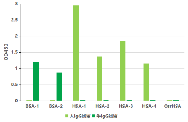yp街机刮刮卡生物的植物源重组人血清白蛋白OsrHSA来源于水稻,可杜绝传播血源性病毒的潜在风险,比血浆来源的人血清蛋白更安全;同时,人类接触和食用大米(水稻)具有几千年历史,与水稻内源蛋白具有长期接触史,对稻米的杂质蛋白具有很高的耐受性和相容性,免疫原性较低,比其他表达体系更安全。由于yp街机刮刮卡生物的辅料级人血清白蛋白不来源于血液,因此完全不含有血液蛋白残留,例如血液中常见的免疫球蛋白,它的存在在药用辅料中将成为潜在致敏源,同时也可能对药品制剂产生影响的风险。虽然市售天然蛋白利用纯化工艺将其大部分去除,但仍有一定残留,yp街机刮刮卡生物的OsrHSA使用IgG ELISA检测则没有检出IgG残留(图2)