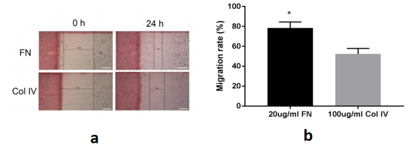 图3. 20μg/ml FN和100μg/ml COL IV预包被培养皿对细胞迁移的影响[10]