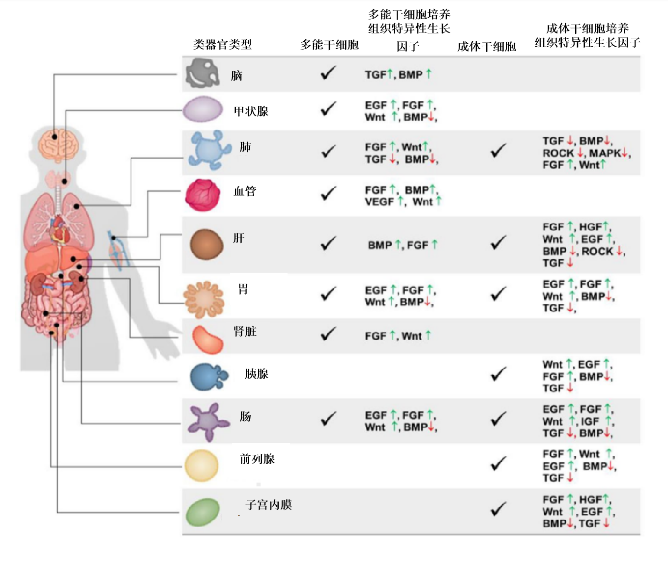 成功建立类器官的关键,除了所需的生物材料基质外,生长因子作为细胞培养、增殖及分化所必需的物质也必当优先考虑,从而保证类器官中的干细胞长期生存的能力。通过优化培养物生长条件模拟生理组织自我更新或损伤修复过程中的干细胞巢环境,如提供基底膜基质(即Matrigengel)并添加一系列激动剂(如Wnt和酪氨酸激酶受体)和抑制剂(如骨形态发生蛋白/转化生长因子-β)可达到上述目的。不同的生长因子组合也能诱导多能干细胞向不同的类器官细胞分化进而获得yp街机·电子游戏(中国)最新官网需要的类器官类型(图1),同时不同的细胞因子也是培养不同种类的类器官的关键物质(图2)。